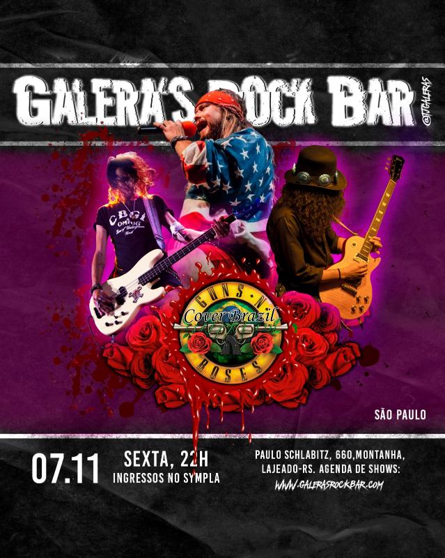Guns n' Roses Cover Brazil/SP! Sucesso de crítica e público, sendo a banda mais autêntica ao Guns N’ Roses da América Latina e estando entre as melhores bandas tributo ao Guns N’ Roses do mundo. A banda Guns N’ Roses Cover Brazil® vem mostrando em performance ao vivo toda a genialidade do Guns N’ Roses desde 1991, quando surgiu sua primeira formação. No mesmo ano a banda foi contratada pela gravadora Geffen, gravadora do Guns N’ Roses, para fazer o show de lançamento dos CD’S Use Your Illusion em plena Avenida Paulista. Por onde quer que passe, a banda costuma deixar a plateia extasiada com sua performance e incrível semelhança com o “Guns” original. Imperdível! Abertura do Bar às 17h. Sonzera às 22h. Ingressos antecipados no Sympla.