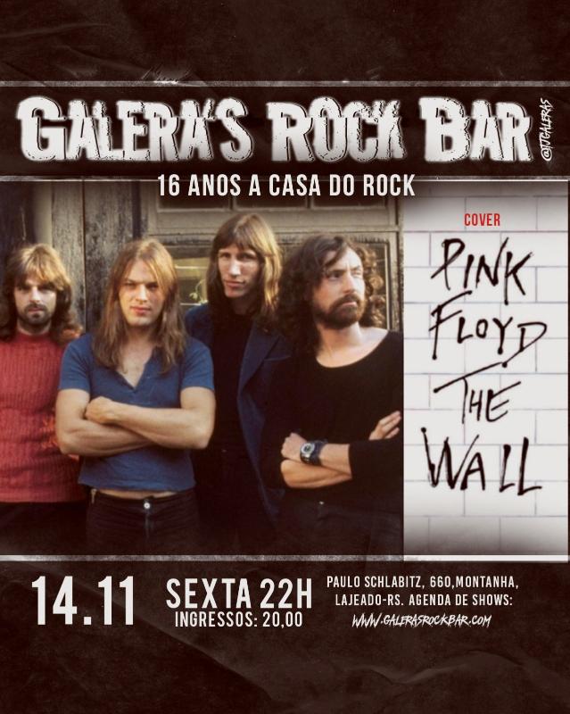 Formada em março de 2004 a banda The Wall tem como proposta interpretar ao vivo, Pink Floyd. Banda inglesa famosa pelas suas apresentações de rock clássico harmônico extremamente elaborado. Músicas que fizeram parte da história do rock, e que estão vivas na cabeça e no espírito de jovens e adultos do mundo inteiro. Abertura do Bar às 17h. Sonzera às 22h. Ingresso R$ 20