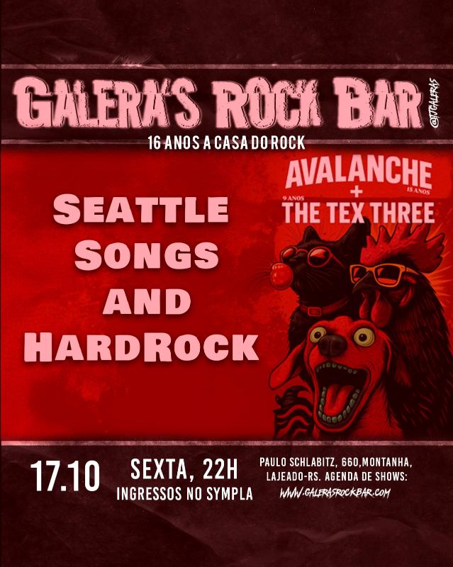 Seattle Songs e Hardrock no Galera's com duas bandas de Sta Cruz do Sul, The Tex Three e Avalanche. Abertura do Bar às 17h. Sonzera às 22h. Ingressos no Sympla.