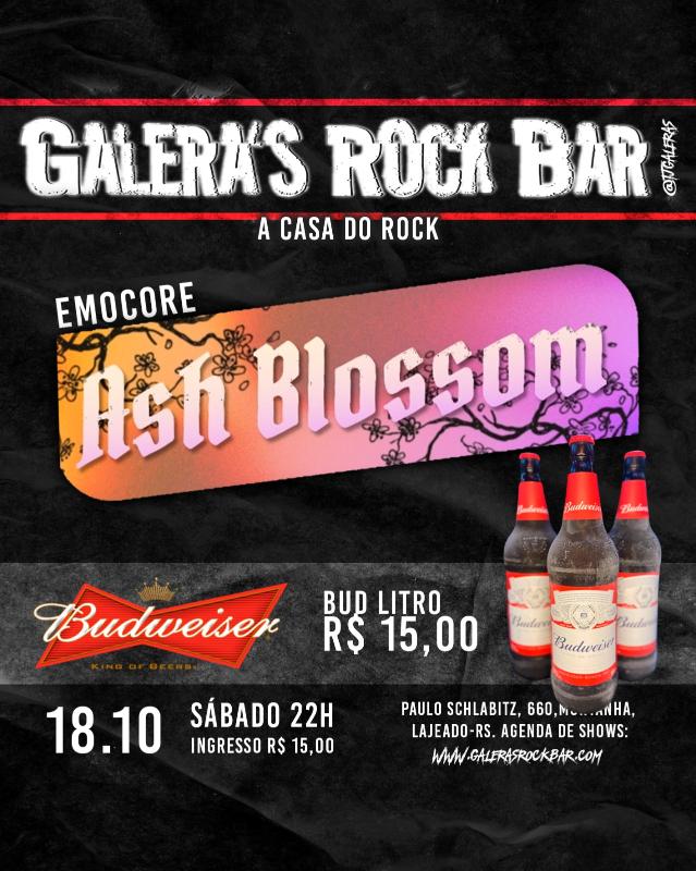 A banda AshBlossom traz um emocore nacional e algumas pedradas internacionais. A noite conta com uma PROMO incrível. Bud 1L por apenas R$ 15. Abertura do Bar às 17h. Sonzera às 22h. Ingresso R$ 15 no local.