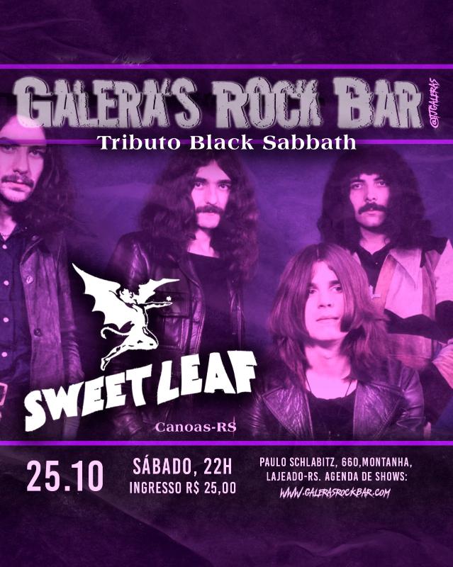 Sweet Leaf - Tributo Black Sabbath no dia 25 do Galera’s. A banda é oriunda da Cidade de Canoas, com o intuito de prestar o Tributo ao Black Sabbath de forma fiel, de modo que ofereça ao público uma experiência muito próxima a de assistir Black Sabbath ao vivo. A fidelidade não fica apenas a cargo visual da banda, todos os timbres, cadência, postura, figurino e modo em que executam os clássicos estão ali, entregando uma experiência sensacional ao público. São mais de duas horas de Black Sabbath! Imperdível! Abertura do bar às 17h. Sonzera às 22h. Ingrerssos R$ 25 no local.