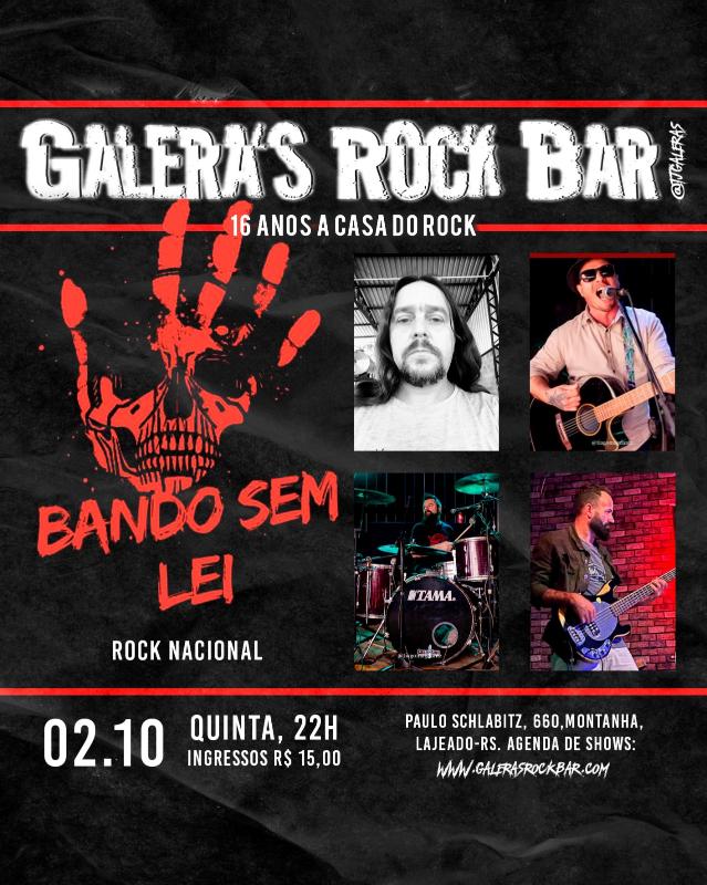 O **Bando Sem Lei** não nasceu para seguir regras. Formado por músicos inquietos, o grupo traz na veia a rebeldia e a poesia que sempre fizeram do rock nacional um grito de liberdade. Mais do que uma banda, o Bando Sem Lei é um manifesto sonoro contra os padrões e fórmulas prontas da música. Com versões autênticas, viscerais e únicas, o Bando Sem Lei mergulha nas raízes do rock brasileiro e o recria com atitude, peso e emoção. Cada show é uma experiência intensa, marcada pela energia crua, letras que cutucam feridas e arranjos que subvertem o óbvio, transformando clássicos em novas histórias e dando vida a canções autorais que soam atemporais. A banda não se prende a rótulos: flerta com o folk, com a fúria do punk, a poesia do rock dos anos 80 e a melodia do novo rock nacional. O resultado é uma sonoridade que une rebeldia, identidade e verdade - sem pedir licença. O **Bando Sem Lei** veio para quebrar paradigmas. Veio para lembrar que o rock ainda é terreno de inconformados. E que, quando a música é feita com coragem, ela deixa de ser apenas som e se torna movimento. Abertura do bar às 17h. Sonzera às 22h. Ingressos R$ 15.